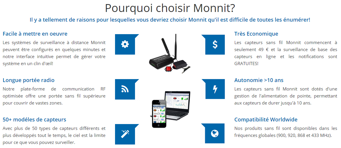 Les capteurs Monnit s’utilisent seul ou en groupe, et s’interfacent à une passerelle. Pour l’utilisation des données du client, Monnit met à disposition des logiciels simples et intuitifs. Pour les utilisateurs désireux d’intégrer une solution Monnit dans une plateforme déjà existante ou pour les développeurs souhaitant revendre leur propre système, des commandes API sont aussi fournies.